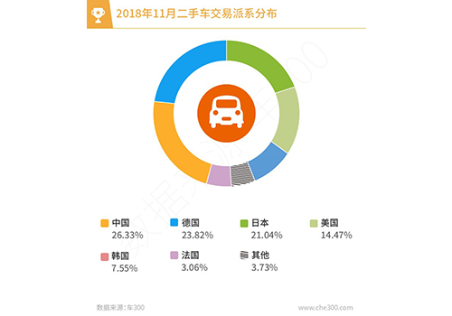 各国别派系占比排名依旧延续上月,自主品牌二手车交易量,占比26.33%,较上月环比微降1.31%,领先于外国品牌二手车交易量,国产车凭借着高配置、低售价,在二手车交易市场赢得部分消费者的认可;德系、日系以较小的占比差距分列第二、第三位。