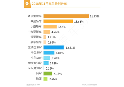 再看SUV车型,总销量约27.5万辆,相比销量近29.9万辆的10月份,交易数量下降约2.4万辆,环比下跌近8%;在SUV车型级别占比中,紧凑型SUV占比最高,达12.31%。