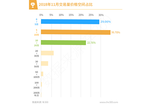 本月二手车交易量价格区间分布中,0~20万元的车辆,为二手车市场的交易主体,约占总体销量的88.52%;5~10万元车型占总体比例最高,为36.70%;与上月相比,0~100万价格区间交易量整体呈下降趋势,平均降幅-9.38%,其中5~10万元车辆交易量降幅最高,为-16.42%。与去年同期相比,各价格区间二手车交易量整体为下跌趋势,平均降幅-18.65%,其中200万以上价格的车辆降幅最高,达-37.95%。