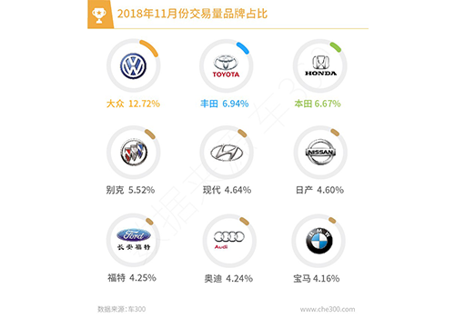 本月二手车各品牌交易量TOP9榜单,排名较上月变化甚小,各品牌销量相比上月,全体呈下降趋势,平均降幅为-13.31%。福特以-20.31%的最高降幅,从上月第六位降至第七位,与日产位置互换;排在第一的大众,本月二手车销量约14.07万辆,交易量总体占比为12.72%,比第二名丰田的销量多出近6.4万辆,但其销量对比上月减少了约2.5万辆;其他品牌二手车交易量均有不同程度下跌。