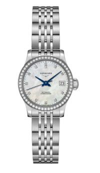 浪琴表开创者系列腕表直径26毫米表壳镶钻,白色珍珠母贝表盘饰以12个钻石时标。其搭载的L592.4自动上链机械机芯,内含单晶硅游丝,与摆轮相配合,确保了稳定的走时性能。浪琴表开创者系列的所有表款均获得瑞士天文台授以的“精密计时器”认证。该款腕表搭配精钢表链。