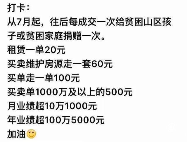几个月后,江军被调到一家新的门店,经理许成友成了他的师傅。除了对他格外关照之外,江军说,许经理在管理上是个“很有招儿”的人。每天会有很多规定动作,比如空看量(经纪人不带客户自行实地看房的数量)和电话量,还会想一些奇葩的制度督促团队,比如制定业绩目标或者规章制度,没做到就捐款给贫困儿童。