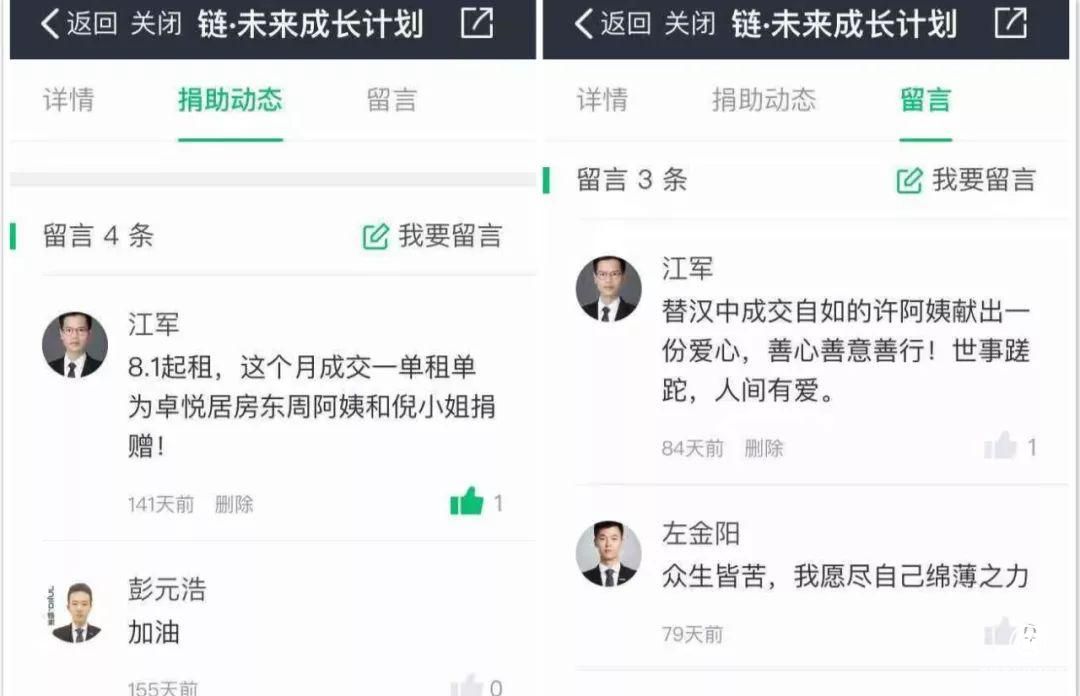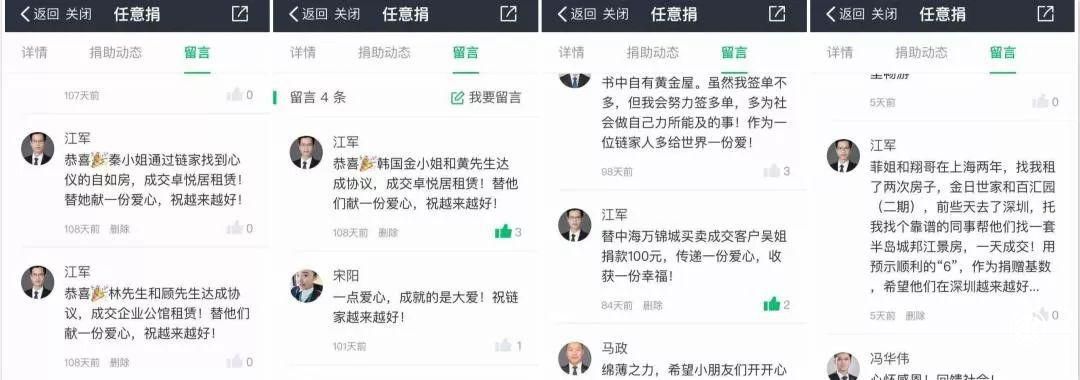 这也启发了江军。他对客户一直心存感恩,不仅因为这是他的衣食父母,更因为客户对他的理解。于是,从今年7月开始,他给自己制定了一个“打卡计划”,每成交一单生意,便通过链家的“链· 未来成长计划”或“任意捐”项目捐款一次。