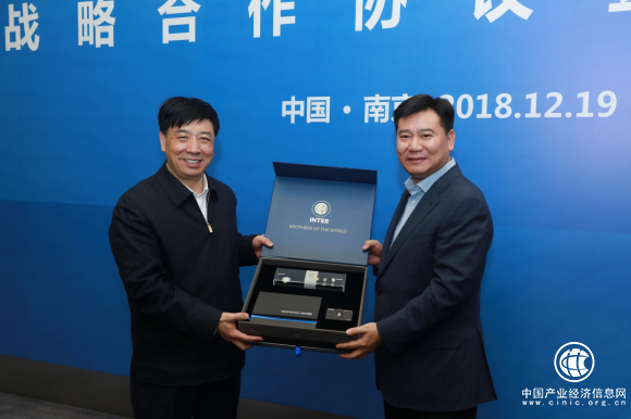 (图为张近东向王耀赠送定制国米礼盒)