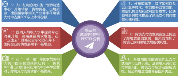 报告创新性的选用了PESTEL模型(大环境分析模型)和波特五力模型进行行业和企业分析。PESTEL(大环境分析)模型分析显示,国内支付机构开展跨境支付业务既面临着政治政策、经济发展转型、人民生活需求提升的巨大发展机遇,但是同时也面临着新技术颠覆传统支付产业模式的挑战,以及世界各国对于跨境资金流动不确定的审慎监管态度的挑战。