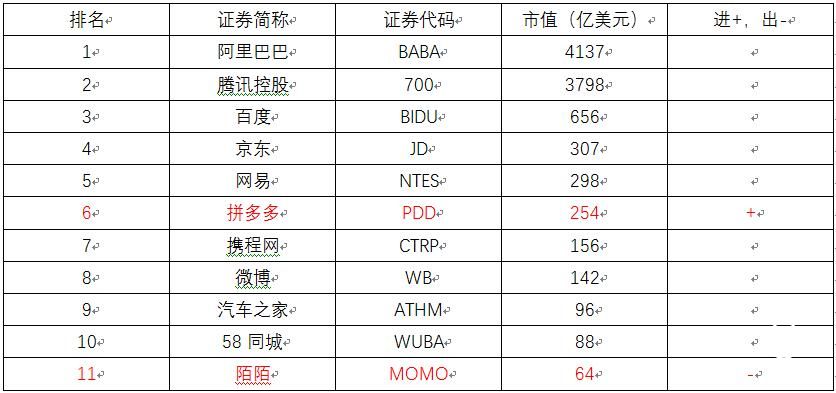 另一方面,10家市值最大的中国互联网公司中((市值数据基于2018年11月底),拼多多以254亿美元的市值空降第6位,市值64亿美元的陌陌被挤出前十席位。