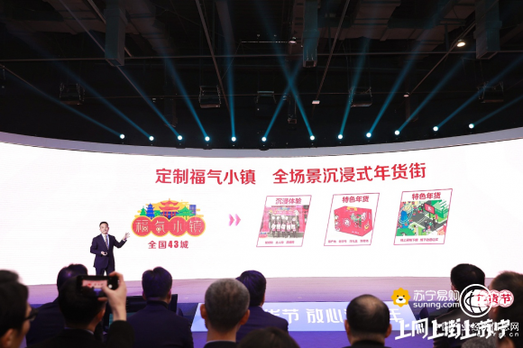 2019苏宁易购年货节媒体发布会上,苏宁易购总裁侯恩龙正式宣布,此次年货节福气小镇将继续围绕“全场景沉浸式年货街”进行打造,主打沉浸体验、特色年货与双线互动。