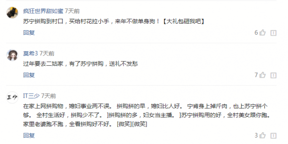 “苏宁拼购到村口,买给村花拉小手,来年不做单身狗!”这几天,苏宁拼购总经理张奎的微头条下被网友玩坏了,变成了段子手的集结地,网友贡献的农村刷墙文案看似土low嗨,实则魔性洗脑。12月27日,苏宁易购年货节发布会上,苏宁拼购总经理张奎放出彩蛋,向全民征集刷墙文案。如今一大波魔性文案被网友们贡献出来,真是墙都不扶,就服网友的文案水平!