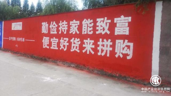 苏宁拼购的刷墙文案这一营销方式,是渠道下沉,节省营销成本的有效手段。广大农村地区,有着庞大又廉价的版位资源,且刷墙文案的视觉冲击力大、成本低、时效长、资源位固定。论给消费者让利,苏宁拼购的这一做法才是真正的让利。