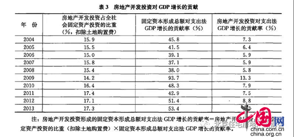 从房地产开发投资对GDP增长的贡献率来看,2004年以来均在5.8%以上,年度间有所波动:2005—2008年低于6.5%;2009年最高,为13.3%;2012年和2013年持续提高,2013年达到9.3%。2004—2013年,房地产开发投资对GDP增长的年平均贡献率为7.8%。详见表3。