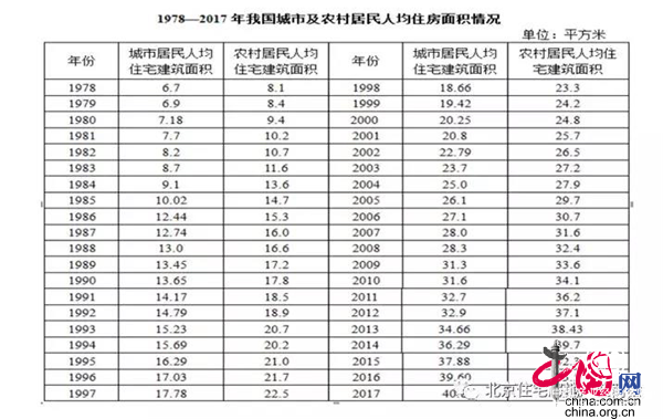 1978年,城镇新建住房仅3800万平方米,1986—1992年,城镇新建住房面积年均在2.4亿平方米以内,其中1990年较少,仅1.73亿平方米;1993—1998年,城镇新建住房面积由3.08亿平方米提高到4.76亿平方米;1999一2004年,城镇新建住房面积年均在5.5亿平方米上下;2005年开始迅速上了多个台阶,由6.61亿平方米提高到2013年的12.12亿平方米。2002—2017年,城镇新建住房共81亿平方米,城镇居民人均住房建筑面积由6.7平方米提高到40.8平方米。