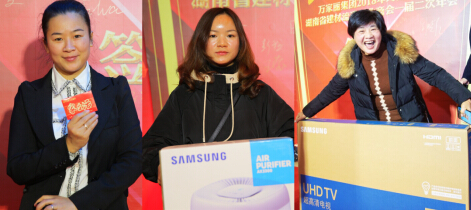 不光是精彩的舞台表演,晚会穿插的三轮抽奖让整个宴会变成了一片欢声笑语的海洋。三星液晶电视机、空气净化器、万家丽生活超市购物卡等众多奖品,让抽奖环节引来阵阵欢呼。