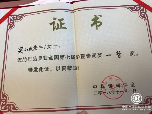 2018年11月20日,中华诗词最高奖“华夏诗词奖”第七届颁奖盛典在广东惠州海王子大酒店举行。本届比赛中,中国歌剧舞剧院青年歌唱家、国家一级演员莫小凤创作的故乡风情的七律《谒凤凰山天问台》荣获一等奖。她是该奖项设立以来,唯一一名获奖的歌唱家,也是最年轻的获奖者。中华诗词学会会长,故宫博物院院长,郑欣淼先生以及副会长范诗银,林峰等副会长诗词专家到会亲自为获奖选手颁奖。华夏诗词奖是由中华诗词学会主办的全国性当代诗词创作评选赛事,是中国最具权威最专业的诗词创作赛事,该奖项每两年在全世界范围内评选一次,目前已成功举办了七届,诗词界泰斗叶嘉莹先生,刘征,欧阳鹤先生等都纷纷支持此赛并获得大奖。