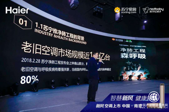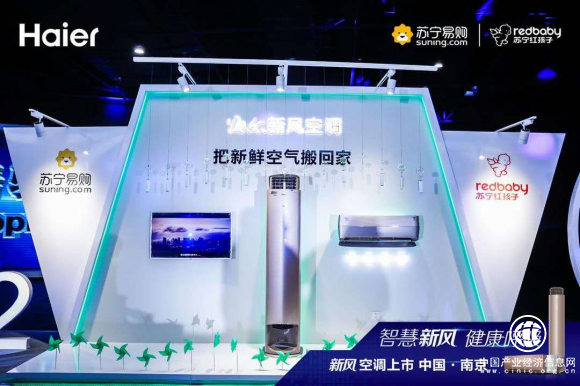 1月16日,海尔新风空调新品苏宁易购首发仪式亮相南京苏宁总部。苏宁易购、海尔空调联合发布海尔新风自清洁空调,正式开启2019年净肺工程——中国家庭新风净肺工程。