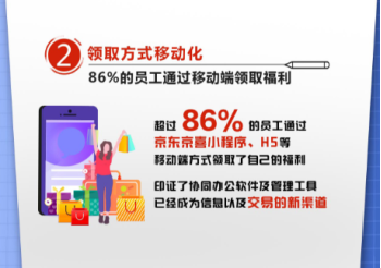 《洞察》显示,2018年通过手机端领取的福利大幅增长,超过86%的企业福利由员工通过京东京喜小程序、H5进行领取,再一次印证了协同办公软件及管理工具已经成为信息以及交易的新渠道。