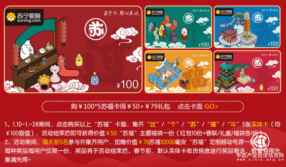 不止如此,活动期间购卡面上含有“过”“个”“苏”“福”“年”的实体苏宁卡,集齐5款卡面即可兑换价值50元的“苏福”主题福袋,每日兑换的前五名用户加赠价值79元的10000毫安“苏福”定制充电宝一台。