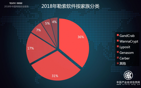 通过对瑞星捕获的勒索样本按家族分析发现,GandCrab家族占比36%,位列第一,其次为WannaCrypt占比31%,以及Lyposit占比17%。