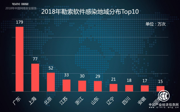 2018年瑞星“云安全”系统共截获勒索软件感染次数687万次,其中广东省感染179万次,位列全国第一,其次为上海市77万次,北京市52万次及江苏省33万次。