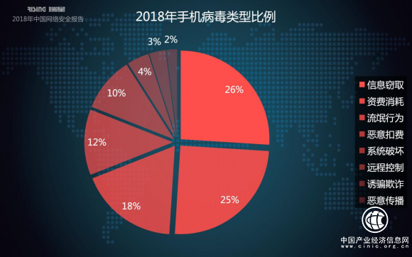2018年瑞星“云安全”系统共截获手机病毒样本640万个,病毒总体数量比2017年同期上涨26.73%。新增病毒类型以信息窃取、资费消耗、流氓行为、恶意扣费四类为主,其中信息窃取类病毒占比26%,位居第一。其次是资费消耗类病毒占比25%,第三名是流氓行为类病毒占比18%。