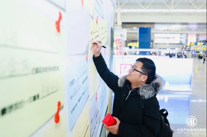 在候车厅,不少乘客的目光被简一互动背景板上的题目吸引, “哪个瞬间让你有想回家的冲动?”、“过年回家,你最想做的一件事情是什么?”,他们走上前,仔细阅读,凝神思考,认真写下心中的话。每一个答案都诉说着一段独一无二的回忆。