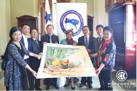 (图:雷玉春副市长向巴拿马省长赠送清远鸡国画)