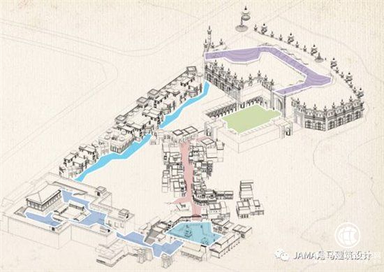 用一条游览动线,串起从中式到西域风格渐变的过程,让游客快速感受丝绸之路上城市风貌的变化。在七个街区空间上强化差异,如:大街、巷弄、广场、 码头、水街等;其次是建筑风格作减法,大基调保持统一,小细部的形状色彩以及文化小品景观丰富各异;再是内外空间应用在商业业态上的合理性,布局大巴扎、异国风味餐饮、风情spa会所、 酒吧、小吃夜市、博物馆等。不仅融合了具有西域风情的建筑外观与符合现代商业业态的建筑功能,还确保了商业的可操作性。