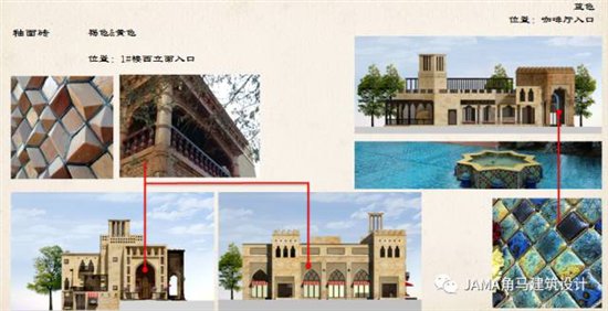 项目立面以石材为主,点缀具有异域风情的仿雕砖、马赛克等材料,酌情使用拱券等造型元素,结合内部功能设置露台、装饰花架等,并根据商业流线上的空间塑造需要,设置具有装饰效果的门头、塔楼等,强调体验式零售业态街区的丰富空间效果,融合出体现西域整体风貌的丝路风格建筑,通过艺术化手法再现了张骞走过的丝绸之路。
