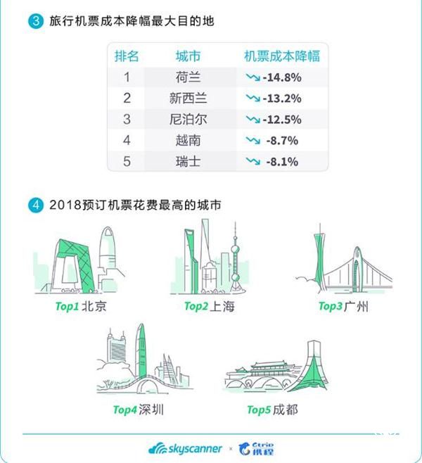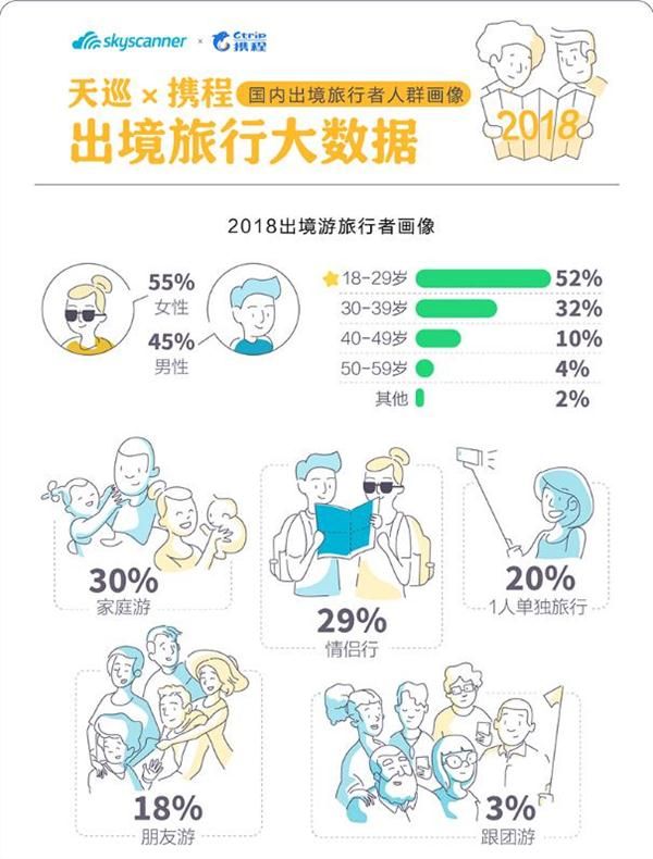 随着春节结束,中国人的2018年也真正走过了尾声。在过去的一年里,又有很多人实现了“世界那么大,我要去看看”的愿望,将脚步迈出了国门,在世界各地留下了自己的身影。更有心怀世界的旅行爱好者已经开始着手计划2019年新的旅程,想要走到更远的地方。为了给广大旅行爱好者提供新一年的旅行灵感,Skyscanner天巡结合2018年中外旅行者的出行预订情况,联合携程发布了《2018年度出入境自由行大数据报告》。该数据报告基于天巡提供的国际机票预订大数据,以及携程对于国内外用户的行为深度分析,从境内旅行者出行偏好、境外旅行者入境偏好、出境游人群画像三个维度全方位解读了2018年度出入境旅游消费趋势。同时天巡与携程还统计了2019年现有的出入境旅游搜索情况,为大家总结新一年的旅行趋势。