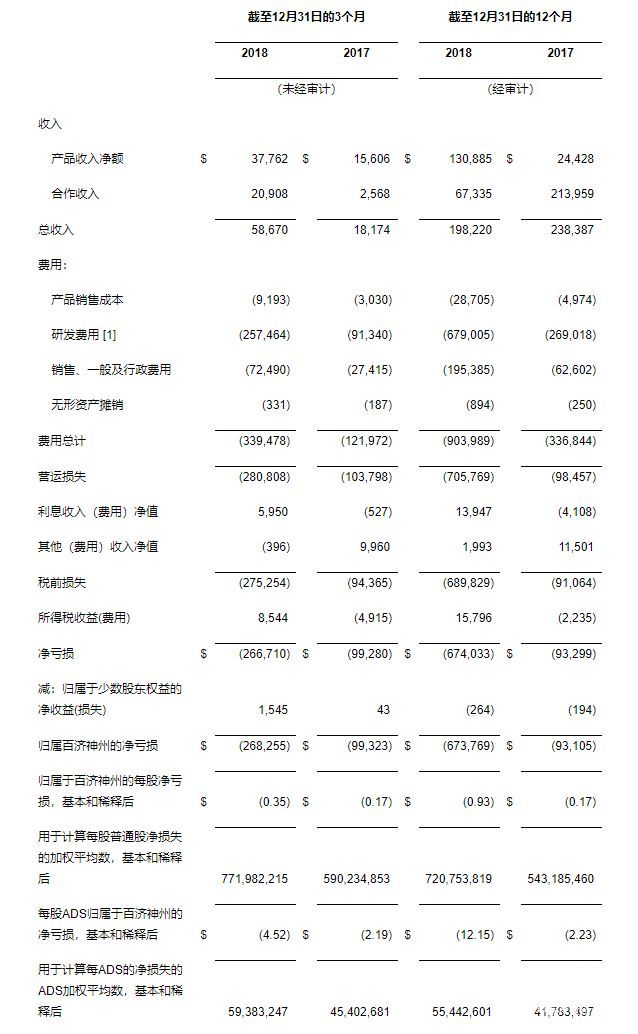 收入2018年第四季度和截至2018年12月31日的年度收入分别为5867万美元和1.9822亿美元,相比2017年同期的1817万美元和2.3839亿美元。季度同比增加源于与新基公司合作带来的产品收入和合作收入;年同比减少的原因是由于2017年与新基公司签订的替雷利珠单抗合作协议生效后获得了转让授权的预付款。