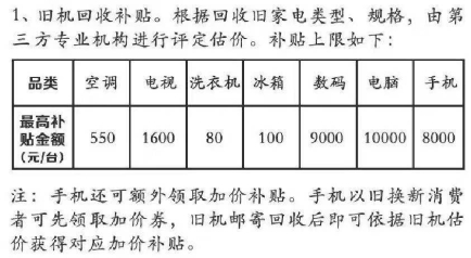其中旧机回收补贴,根据旧家电的类型不同,会有不同的补贴额度,例如旧电视机的补贴金额上限是1600元,而旧手机的补贴上限则高达8000元。