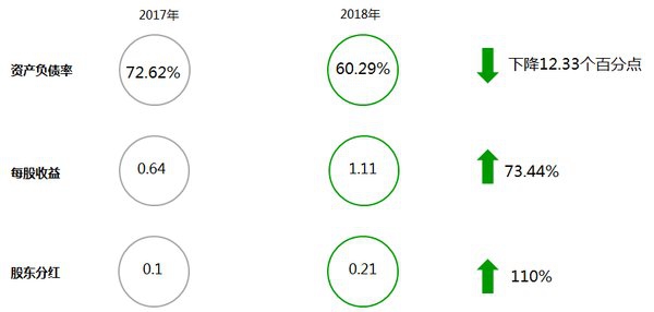 北京2019年3月12日--新奥生态控股股份有限公司(简称“新奥股份”,SH600803)于今日发布了2018年度报告,营业收入达到136亿元人民币,比去年同期增加35.84%;归属于上市公司股东的净利润达到13.21亿元人民币,较去年同期增长109.37%;以上两个亮眼数据,均创上市公司历史新高。此外,报告期内公司还顺利完成配股发行工作,通过股权融资使公司的杠杆率有效降低,资产负债率由年初的72.62%下降为60.29%,优化了公司财务结构。基于公司良好的业绩表现,2018年度新奥股份的每股收益达到了1.11元,较去年的0.64元提高了73.44%,每10股派发红利由去年的1.00元提高到2.10元(含税),增幅达110%。