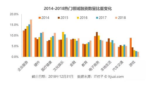 另外,从2018年我国新经济领域获投数量来看,排名前三的行业分别为企业服务、硬件、医疗健康领域。同时,纵观2014-2018年的热门领域融资数量变化,企业服务、硬件、医疗健康三大领域的融资数量是不断攀升。种种数据表明,ToB领域终于又迎来了资本市场的目光。