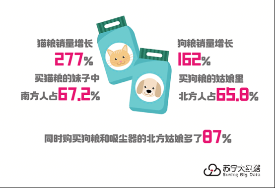 同时,苏宁数据还不忘给不同的女性群体打标签。例如撸猫撸狗的女性,在宠物吃穿用度上也很大方。看来,随着315全民焕新节的深入,女人们的消费态度更具主见性和针对性。