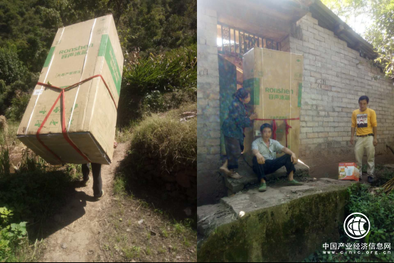 而为了让顾客早日用上全新的家电,很多时候刘老板与送货师傅都是背着数百斤重的家电走上几里山路。到了顾客家,原本厚实的牛皮纸外包装也早已被汗水浸透。“轻点的还能一个人背,有时送重的家电就得几个人抬花轿了!”
