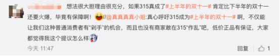 该网友表示,希望能将315打造成上半年的双十一,同时还列举出了五大理由来证明自己的观点,其中包括:购物节都集中到了下半年,上半年零售行业没有购物节,新品上架活动都少了许多,消费者想换新产品都没地方换;临近315,举办购物节既可以保障消费者权益还可以推动商家进行服务升级;下半年有双十一,为避免“一家独大”上半年也需要有个双十一……