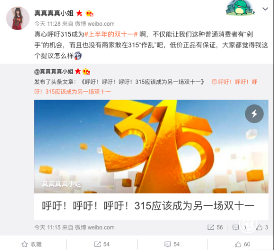 该博主在文章里还提到:双十一最吸引我们的,是它的“便宜”,而315大家最关注的问题便是“正品”和“诚信”,如果将两者结合起来,在315期间打造类似“上半年的双十一”,使购物节不仅有双十一的低价优惠、打折换新,还有315的正品保障……