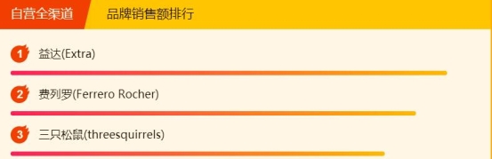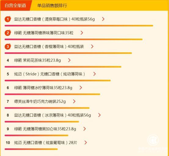 零食普遍受到小朋友、少男少女以及注重生活品质人群的喜爱,闲着的时候嚼一嚼零食不仅照顾了自己的味蕾,也打发了无聊的时间,更是小两口看电影的必备。从榜单来看,“笑出强大”广告做的飞起的益达成为销售冠军,“坚果专业户”三只松鼠排名第三,巧克力品牌费列罗排名第二。从排名来看也说明了零食爱好者的喜好,巧克力与口香糖都属于出门可以带着走哪个路口全都有的存在,把坚果做成如此成功的也就只有三只松鼠了。