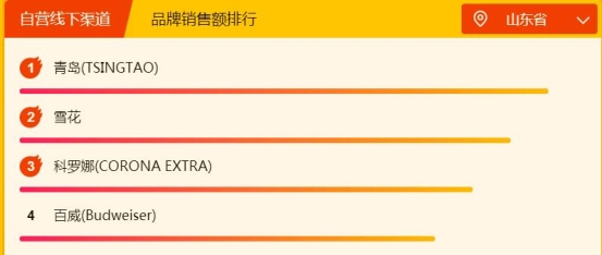 有趣的是,我们观察山东省线下销售排行发现,除了青岛雪花之外,山东人还十分喜爱外国品牌科罗娜,百威也占据第四的位置,看来来自啤酒大省的山东人民对于啤酒的鉴赏水平还是很高的,青岛亲儿子自然喜爱,外国洋品牌也要尝一尝。