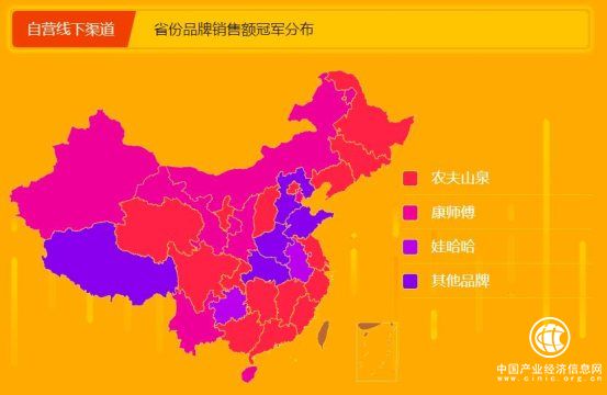看一看省份品牌销售额冠军分布图,我们发现大西北地区形成了两家鼎立的态势,新疆与内蒙古最爱康师傅,青海最爱农夫山泉。农夫山泉、康师傅与哇哈哈的粉丝可谓是遍布大江南北,东北与南方地区最爱农夫山泉。