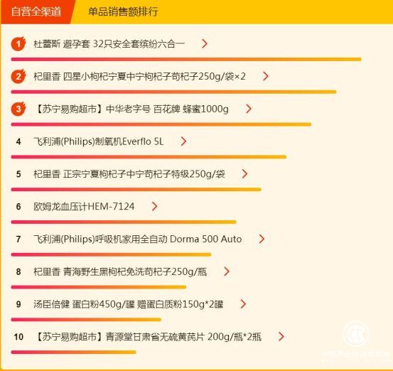 通过单品销售额排行我们可以看出一些端倪。喜爱广告创意营销的杜蕾斯位居单品榜单第一,可谓是赚了个盆满钵满,前十里医疗类的还有制氧机、血压计、呼吸机等等,养生类的有蛋白粉、枸杞等,基本上都是大补的。“人到中年不得已,保温杯里泡枸杞”看来这句台词绝不是戏谈。