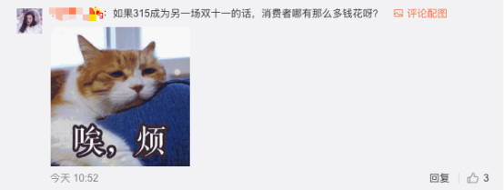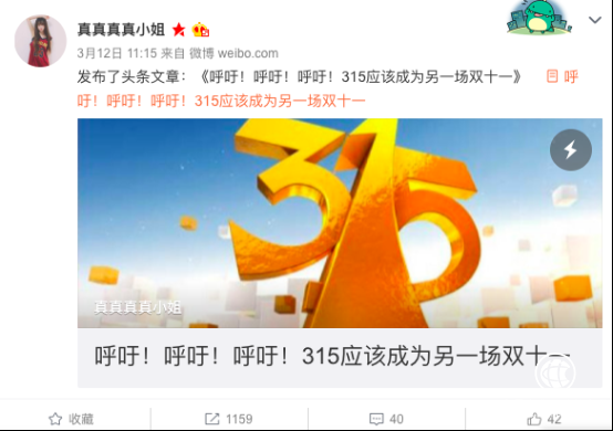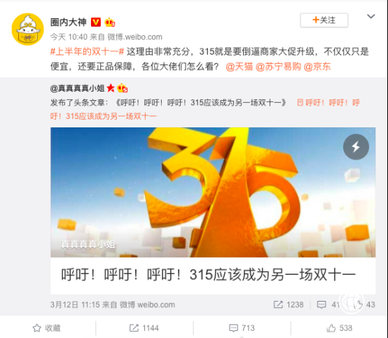就在昨天,该网友在微博上发布了标题为《呼吁!呼吁!呼吁!315应该成为另一场双十一》的文章,在文章里言辞恳切、理由充分地呼吁电商在315期间进行大促升级,为消费者打造真正省心、放心、换新的“上半年双十一”。