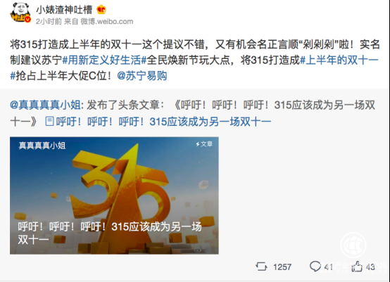 @小婊渣神吐槽:将315打造成上半年的双十一这个提议不错,又有机会名正言顺“剁剁剁”啦!实名制建议苏宁#用新定义好生活#全民焕新节玩大点,将315打造成#上半年的双十一#抢占上半年大促C位!@苏宁易购
