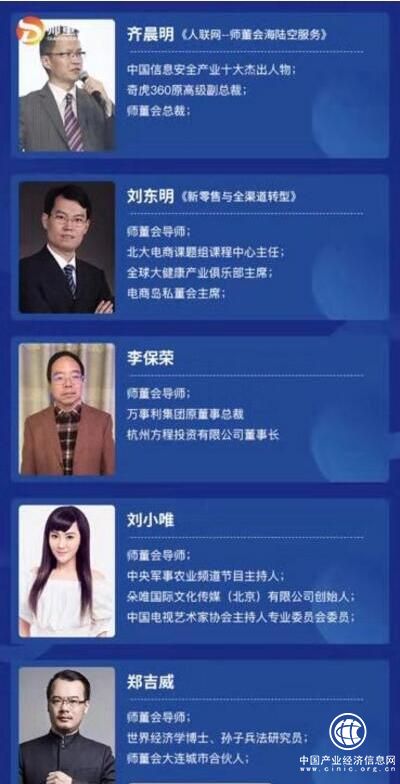 2019·产业中国·大美汝州-《民营企业经济高峰论坛暨中国中小企业大讲堂》1500人企业家活动【拟邀嘉宾】 龙永图:国家外经贸部原副部长;全球CEO发展大会联合主席; 胡海平:师董会主席、2018光荣浙商、2018中国十大经济影响力人物、杉杉集团原总裁;刘东明:师董会导师、北大电商课题组课程中心主任、全球大健康产业俱乐部主席、哈佛大学游学团发起人。吴克忠:师董会导师、财中金控董事长、优势资本董事长; 齐晨明:师董会总裁、中国信息安全产业十大杰出人物、奇虎360原高级副总裁;谈剑峰:师董会导师、全国信息安全标准化技术委员会委员、众人科技董事长; 贾云峰:师董会导师、光荣浙商、联合国世界旅游组织中国专家、德安杰环球顾问集团董事长; 常伟斌:工信部中小企业发展促进中心公共服务平台主任; 廖文剑:师董会导师,蓝源资本创始人、董事局主席; 李保荣:师董会导师、万事利集团董事总裁、杭州方程投资有限公司董事长。
