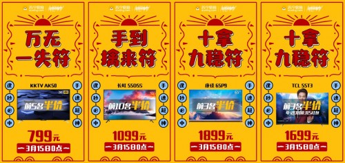 3月15日0点开抢,KKTV50吋4K人工智能电视,半价仅需799元;康佳65吋4K全面屏电视,半价仅需1899元;TCL55吋4K曲面全面屏人工智能电视,半价仅需1699元。