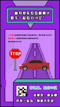 除了上面介绍的两款小游戏之外,还有一款小游戏相信很多小伙伴们应该都比较熟悉了,那就是“抢车位”。通过把车停在好友的车位来“赚钱”。如果不把车停入车位,需要支付每分钟X元的油费,所以小伙伴们为了抢到一个车位通常都要花费不少心思。而这次苏宁将这个超级费脑的小游戏又带了回来,相信小伙伴们互相之间肯定少不了为了抢到“车位”而绞尽脑汁吧!