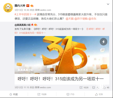 这不,随着315的渐渐临近,想把每个节日都变成购物节的剁手党们又有了一个“大胆的想法”。近日,微博上某网友突发奇要将315打造成“上半年的双十一”的呼吁,便引起了不少大V和网友的热议和支持。
