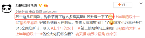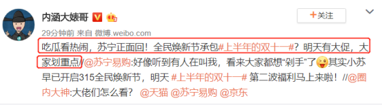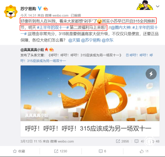 随着剁手党们的呼声越来越高,这个瓜也越吃越热闹、越吃越精彩。不少大V和吃瓜网友在呼吁315大促升级的时候,还不忘搞事情直接粗暴地艾特出天猫、苏宁和京东等电商平台,向各位“爸爸”们施压。