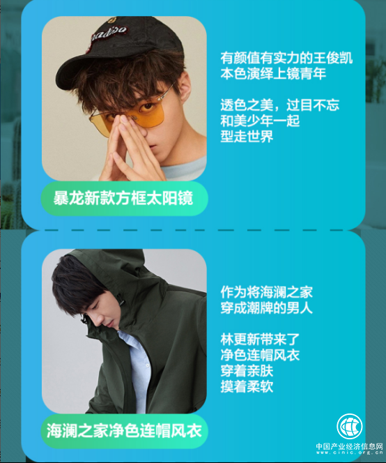 “超新星计划”推出的系列新品同样表现出色,周生生王者荣耀联名款吊坠从朋友圈火到抖音、微博,其中象征“诗酒人生”的李白同名款最受欢迎。还有海澜之家林更新同款外套、暴龙王俊凯同款太阳镜、太平鸟芝麻街联名款T恤、水星家纺HelloKitty款四件套....等新品也销售可观,可见IP联名款单品和明星同款单品的带货能力都不可小觑。此外,随着春天气温回升,浪莎打底袜,红豆的男士衬衣等春日单品也成为消费者眼中的香饽饽。
