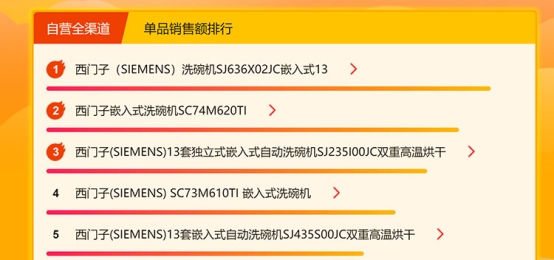 单品销售额排行方面,西门子品牌成为今日大赢家,前五名均被西门子品牌推出的洗碗机占据,而且这五款产品居委嵌入式,可见用户在为家中购入洗碗机时,对于洗碗机是否占用厨房额外空间非常重视。