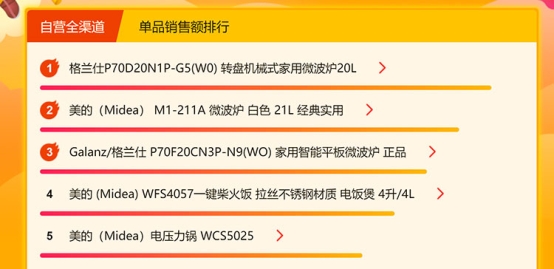 单品销售额排行方面,格兰仕的两款微波炉单品拿下第一和第三,美的的三款单品(分别时微波炉、电饭煲和电压力锅)则占据第二、第四和第五,不知道随着消费者继续购物,是否会带来品牌销售额排行方面的变动呢?我们也对此充满好奇。